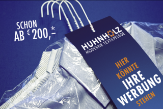 … auf unseren Bügelhängern, die wir insgesamt mehr als 60.000 MAL IM JAHR an die gereinigten Textilien unserer Kunden anhängen. Das entspricht einer Auflage von manchem Stadtmagazin!
